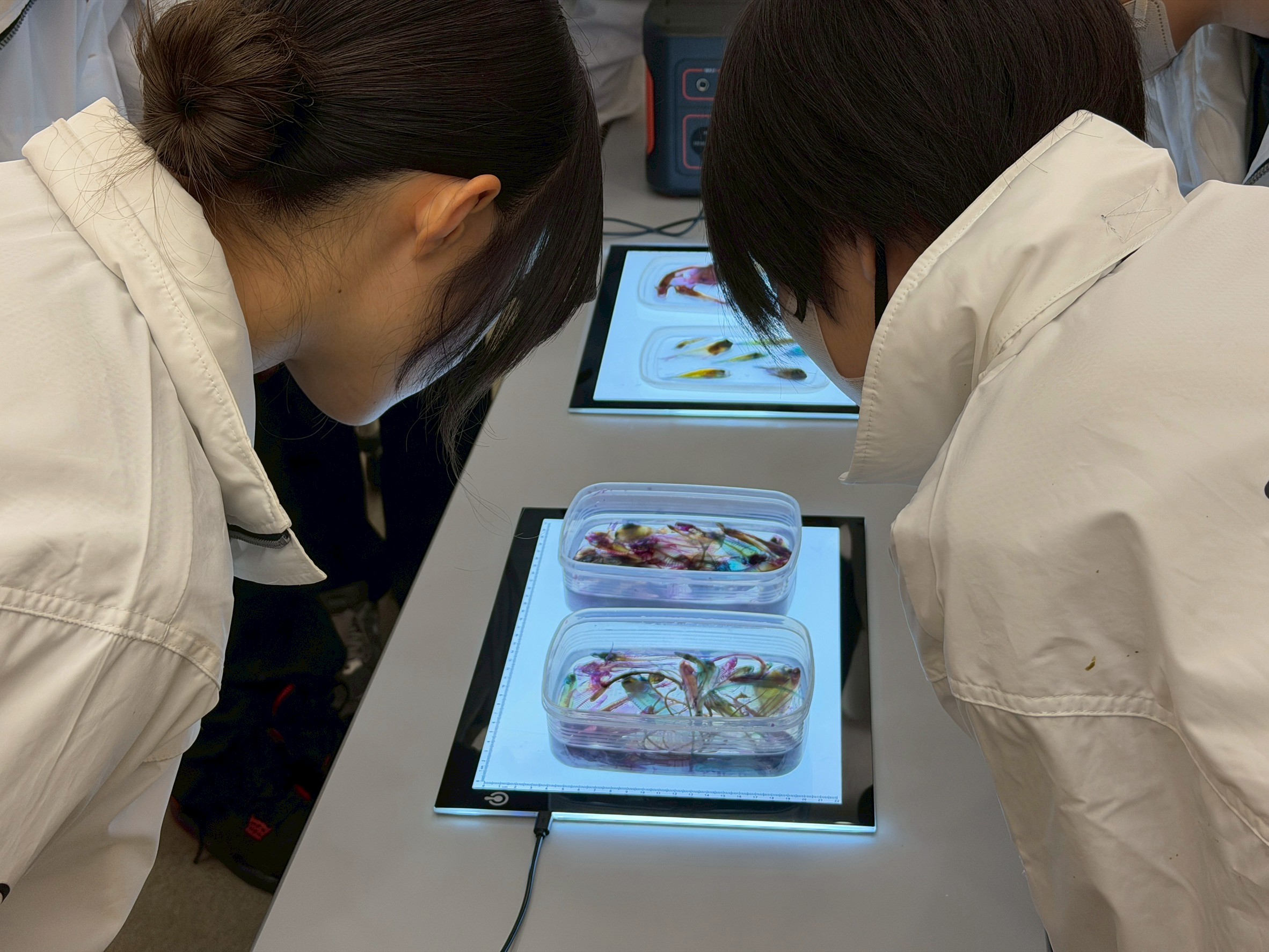 みんなで実際に透明標本の瓶詰め作業を体験しました✨
