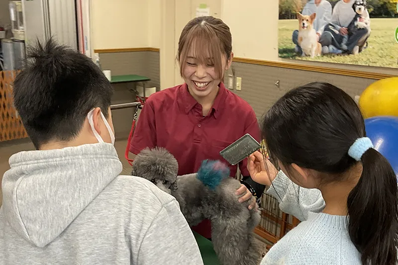 ルネサンス・ペット・アカデミーの学生たちと、ワンちゃんの元気を支える「グルーミング」を体験。カットやシャンプー、ブラッシングなど、本物のトリマーのお仕事に挑戦できます。