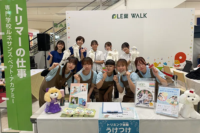 プレ葉ウォーク浜北で行われている、小・中・高生のみなさんにいろんなお仕事を体験してもらえるイベント。ルネサンスのブースでは、本物ソックリなワンちゃんの実習用マネキンを使って、ブラッシング体験などができます。